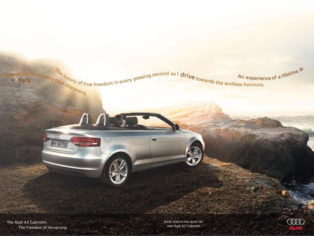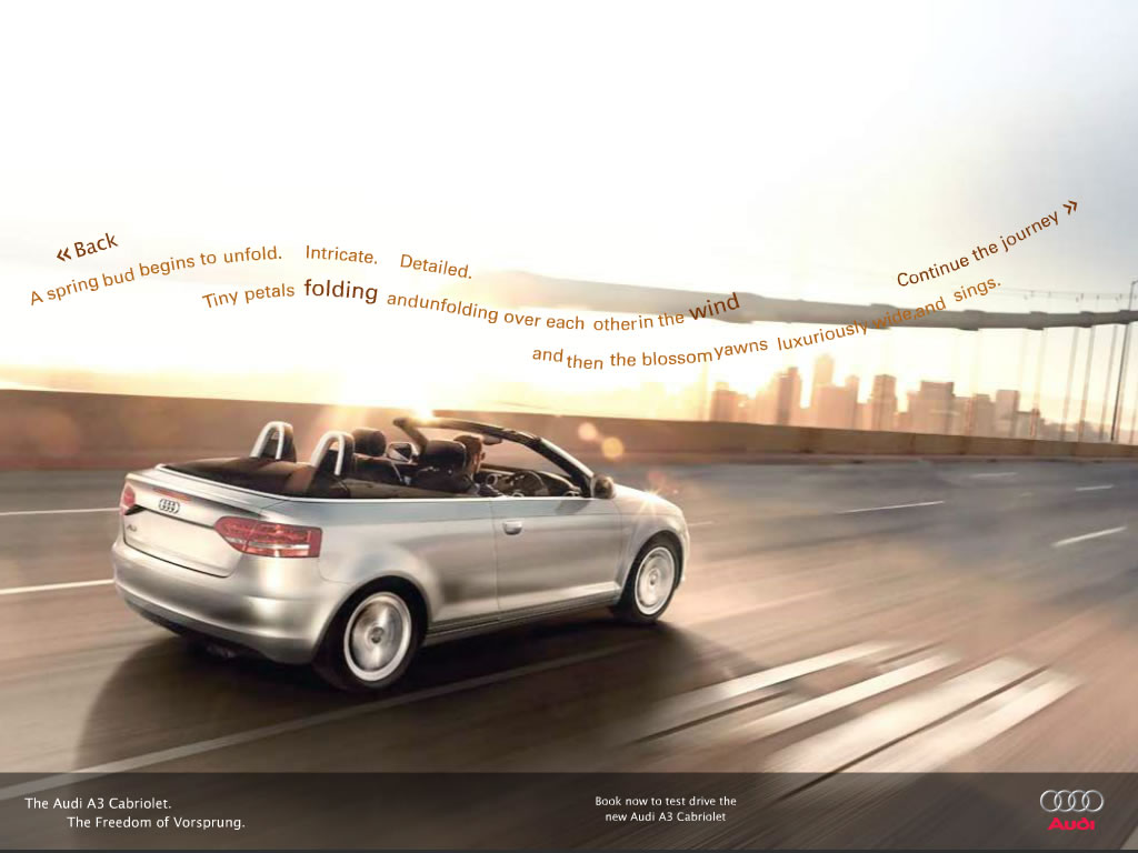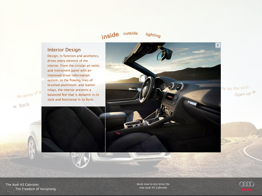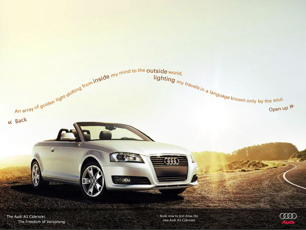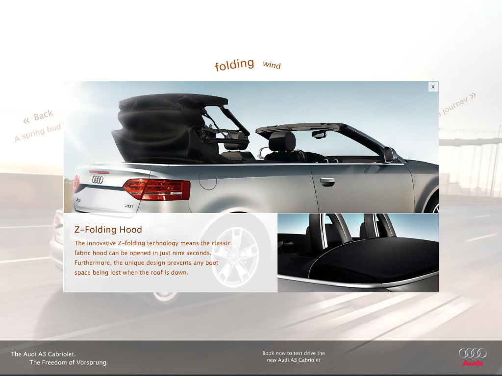 A simple yet fresh microsite aimed at portraying the luxurious openness of the new Audi A3 Cabriolet. Visitors are prompted through a short journey of discovery highlighting the vehicle's key features, inside and out.