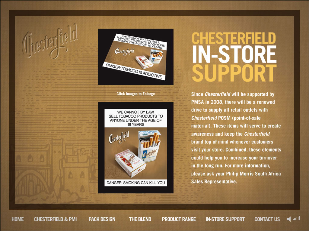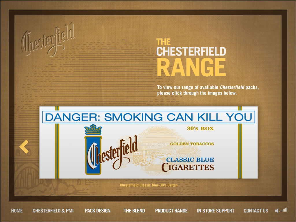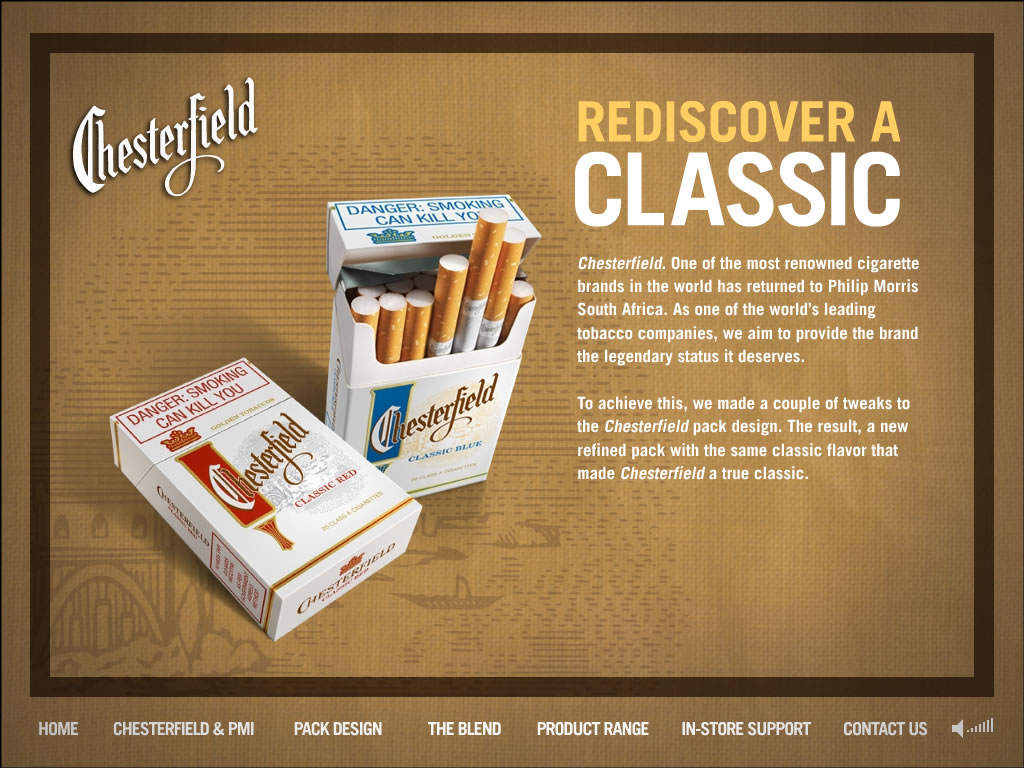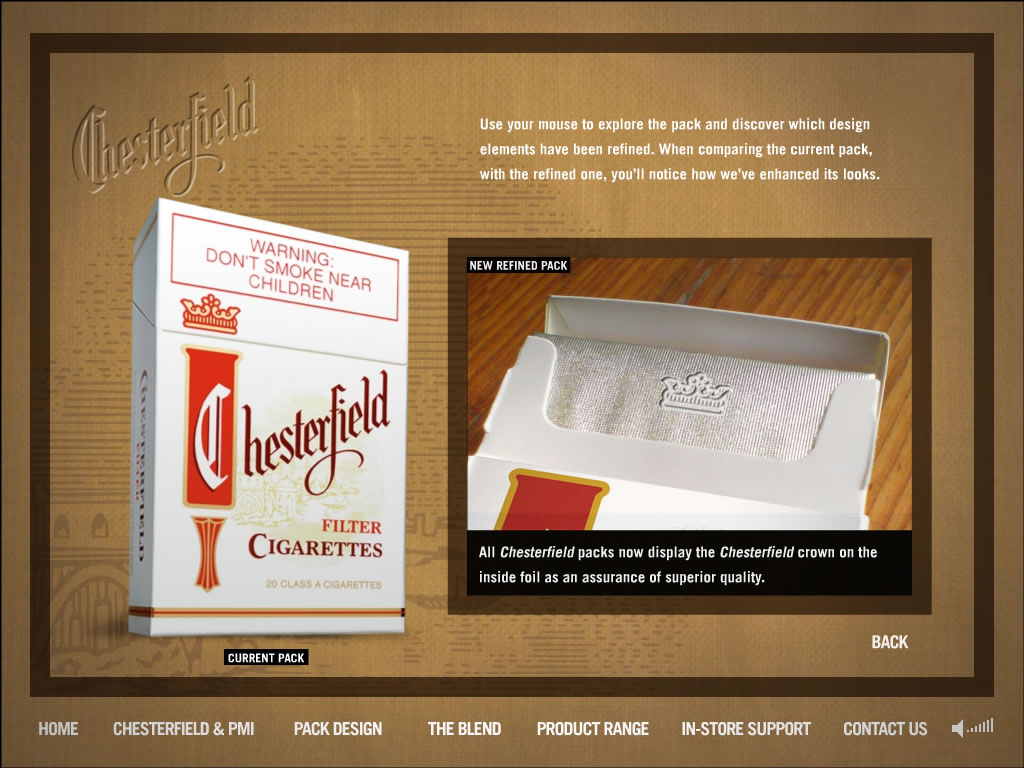 A small interactive toolkit aimed at informing staff and promoters of Chesterfield cigarettes of the new refined look the brand would be moving into. The presentation features a side-by-side comparison of old and new look packs.