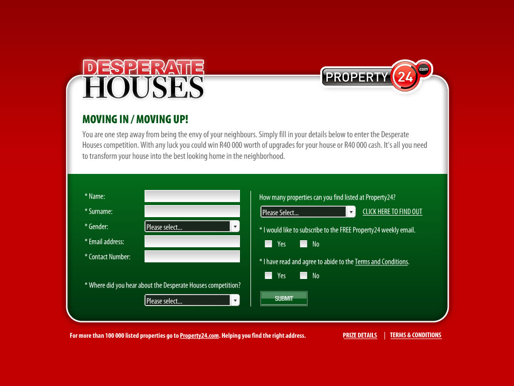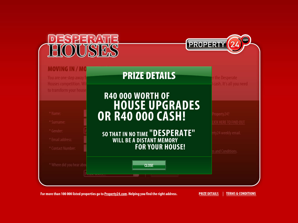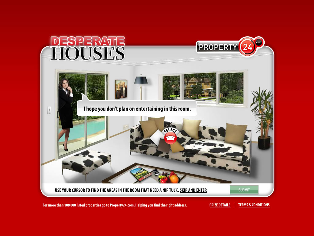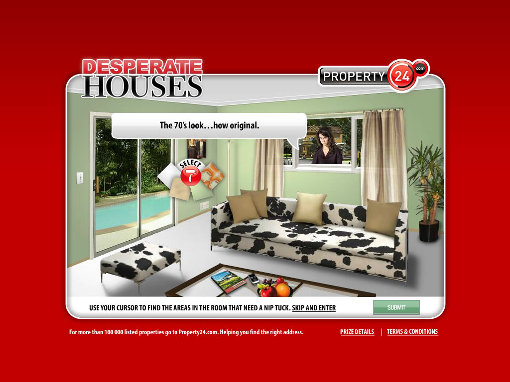 Fun competition microsite promoting Property24 that was based on the popular TV series, Desperate Housewives. The site allows visitors to sample what winning the prize would be like by decorating a home at the click of a button whilst getting the constant back-chat commentary of their nosy neighbours.