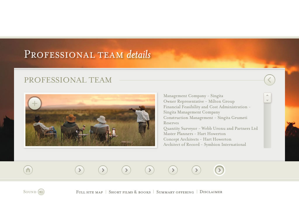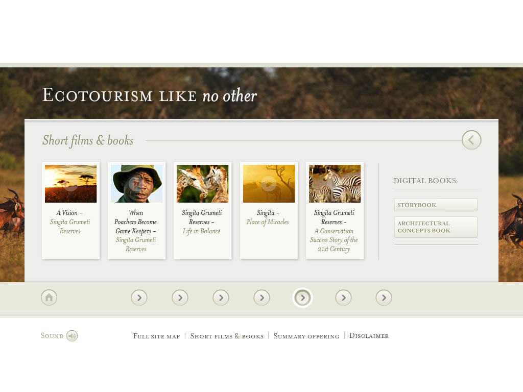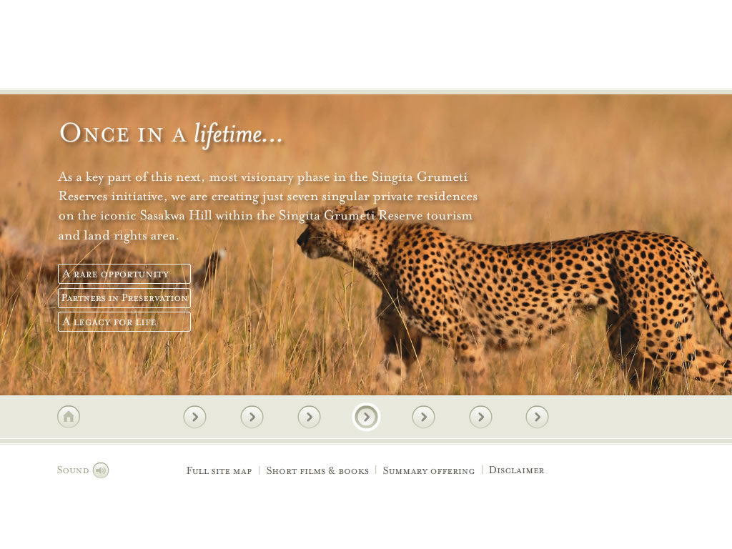 The site puts the user in the Serengeti by immersing them in awe-inspiring panoramic views and subtle sounds of the natural wildlife whilst browsing property plans, activities and the brief history of the area.