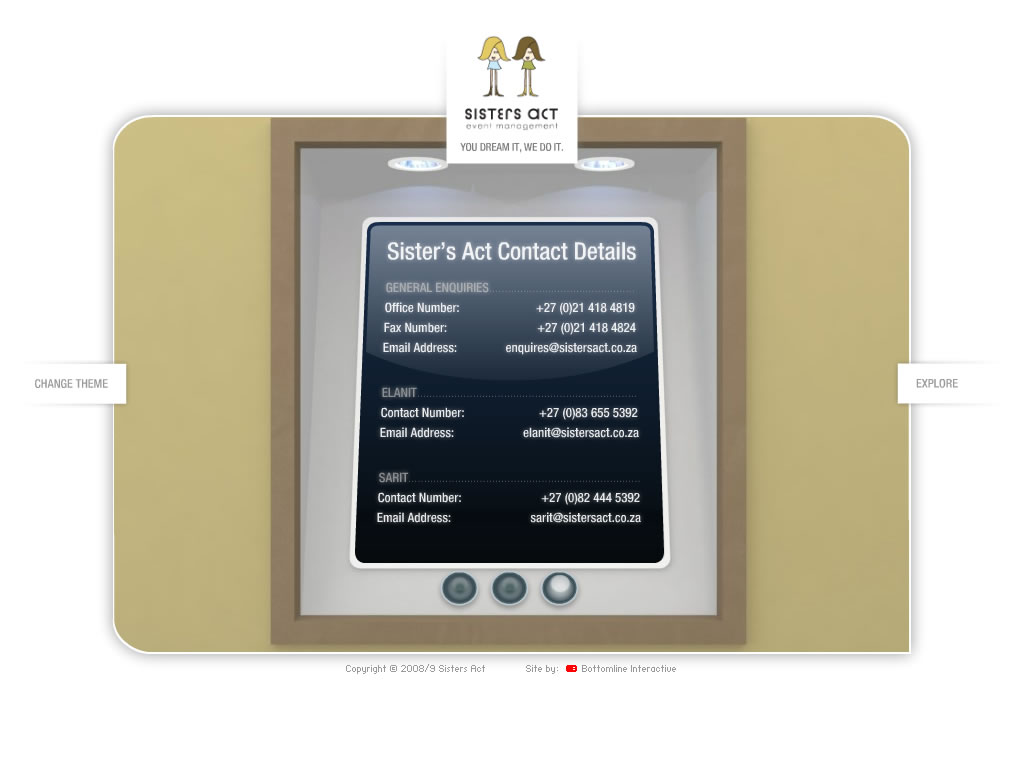 An interactive site that showcases the creative capabilities of events coordinators, Elanit and Sarit. Enabling a user to transform the site at the touch of a button using different built-in themes, this site reflects what the Sisters’ can do for any event.